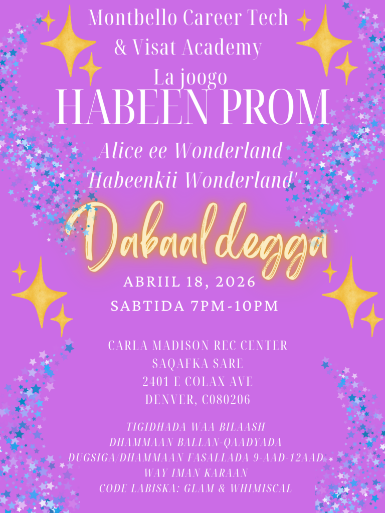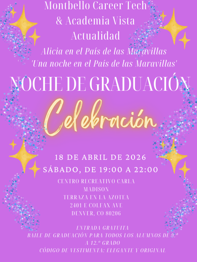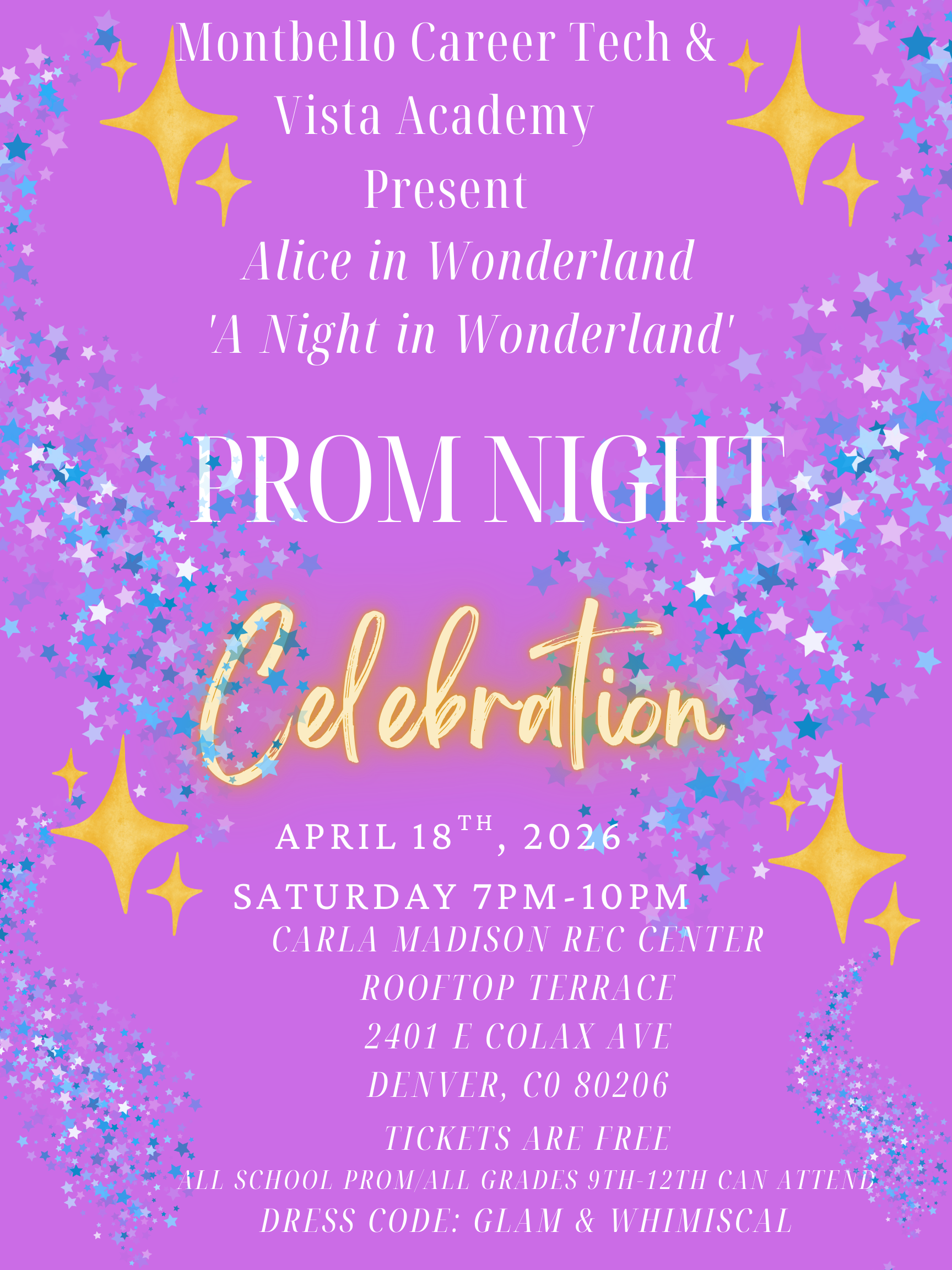 Step into a world of wonder at this year’s Prom, Alice in Wonderland: A Night in Wonderland! Join us on Saturday, April 18, 2026, from 7:00–10:00 PM at the beautiful Carla Madison Rec Center Rooftop Terrace (2401 E. Colfax Ave) for an unforgettable evening of music, dancing, and magical memories. Dress to impress and prepare for a night filled with enchantment, creativity, and celebration as we transform the rooftop into a whimsical Wonderland experience you won’t want to miss.